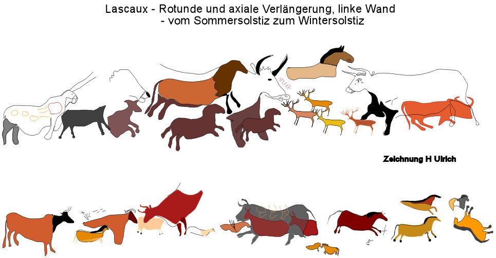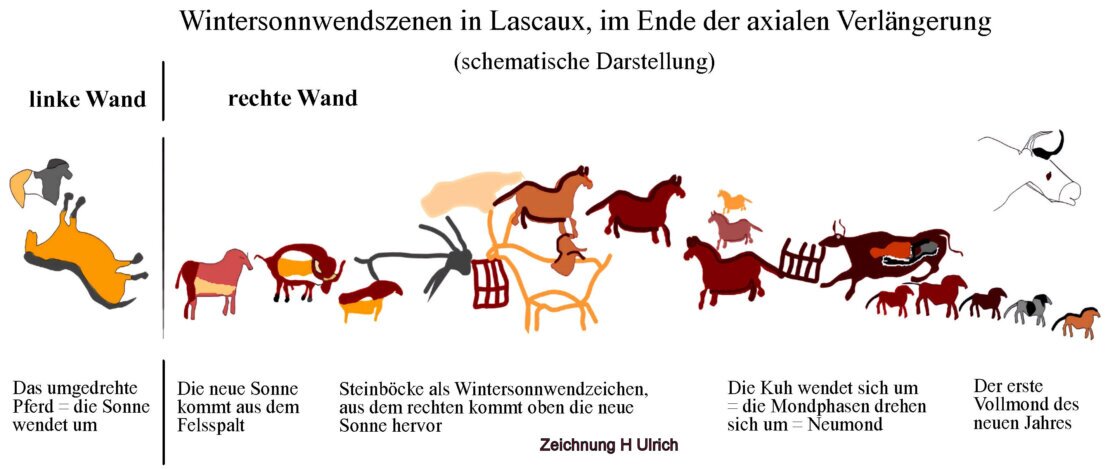 Le bison rouge à droite et les bovins noir et rouge dans le diverticul axial représentent chacun une nouvelle lune. Il s'écoule donc quatre mois jusqu'au solstice d'hiver en bas à droite. Celui-ci est représenté par les chevaux jumeaux. Ici, le deuxième cheval est non seulement retourné horizontalement, mais aussi verticalement. Cela a donné lieu à l'ancienne appellation « cheval tombant ».